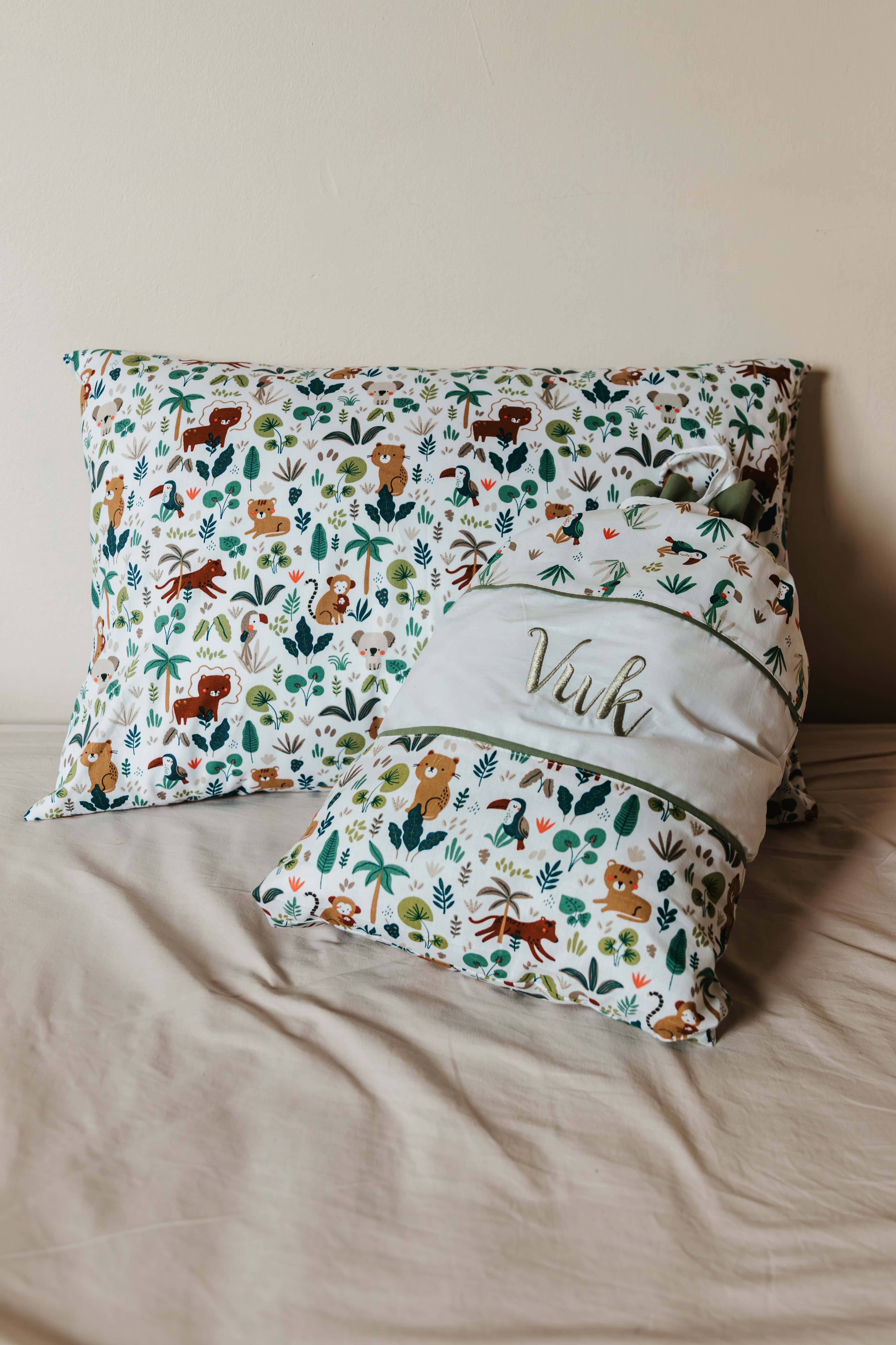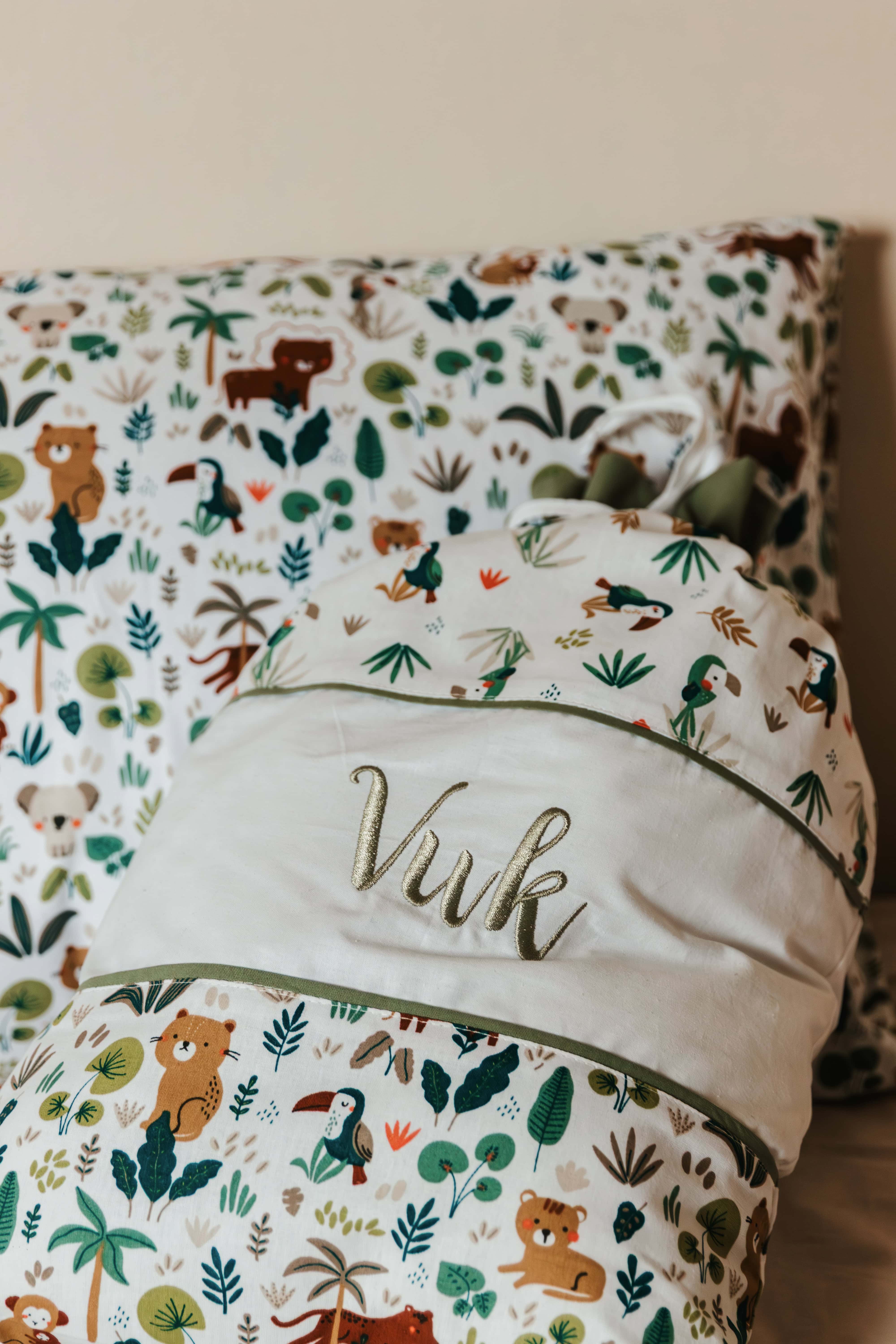 Naš najprodovaniji set za decu su set pamučne jastučnice sa vezom imena kao I torbice. Dezan Jungle uvek aktuelan i za dečake i devojčice.